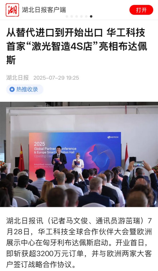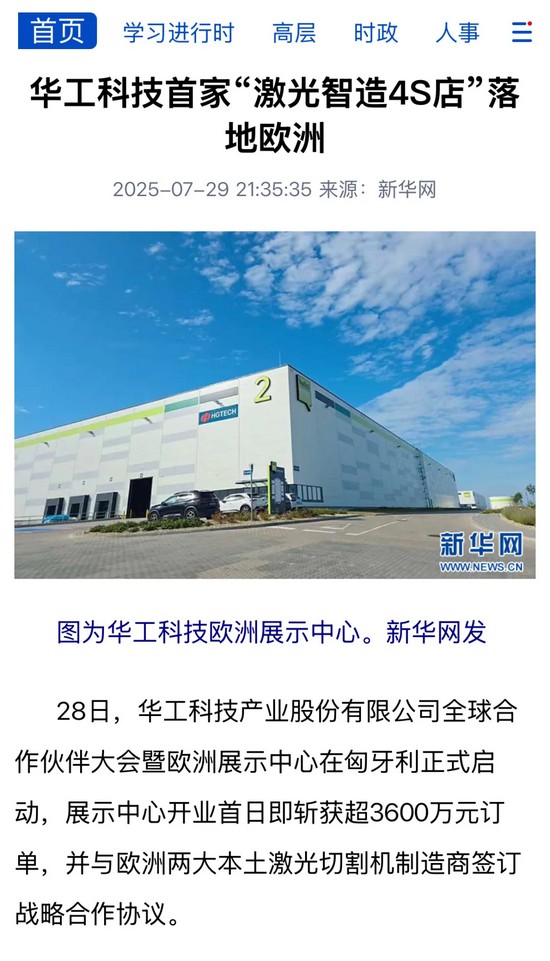 7月29日,華工科技全球合作伙伴大會暨歐洲展示中心在匈牙利布達(dá)佩斯啟動。該中心將汽車4S店的服務(wù)理念引入工業(yè)制造領(lǐng)域,融合展示、銷售、服務(wù)和解決方案四大功能,提供本地化提貨的一站式服務(wù),大幅縮短了歐洲客戶的交付周期和本地服務(wù)響應(yīng)速度,交付周期從幾周甚至幾月,縮短到最快72小時。會上,華工科技發(fā)布“全球發(fā)展戰(zhàn)略計劃”和全球人才計劃“HERO PLAN”,以及為海外市場升級打造的全新一代三維五軸激光切割智能裝備。