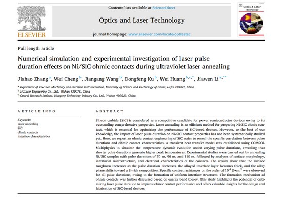 近日,華工科技中央研究院與中國科學(xué)技術(shù)大學(xué)合作開展的寬禁帶化合物半導(dǎo)體激光退火研究取得重大進(jìn)展,由中國科學(xué)技術(shù)大學(xué)李家文教授為通訊作者,華工科技中央研究院半導(dǎo)體項(xiàng)目技術(shù)負(fù)責(zé)人黃偉博士為共同通訊作者所著的論文《Numerical simulation and experimental investigation of laser pulse duration effects on Ni/SiC ohmic contacts during ultraviolet laser annealing》在國際知名學(xué)術(shù)期刊《Optics and Laser Technology》正式發(fā)表,標(biāo)志著我國在半導(dǎo)體激光制程領(lǐng)域的基礎(chǔ)研究獲得國際學(xué)術(shù)界認(rèn)可。